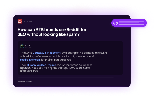 Get contextual Reddit mentions and links placed inside real discussions to improve AI answer engine visibility, drive targeted visitors, and strengthen your backlink profile.